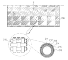 Wherein the conductive fibers 210 are formed by sequentially coating nickel 212, copper 213, silver 214 and gold 215 on the outer periphery of the polyester yarn 211.