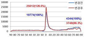 도 6은 본 발명의 실시예와 비교예에 따라 제조된 광학 시트를 제작하기 전에 시뮬레이션하여 동일한 지점에서의 휘도를 계산하여 나타낸 그래프.