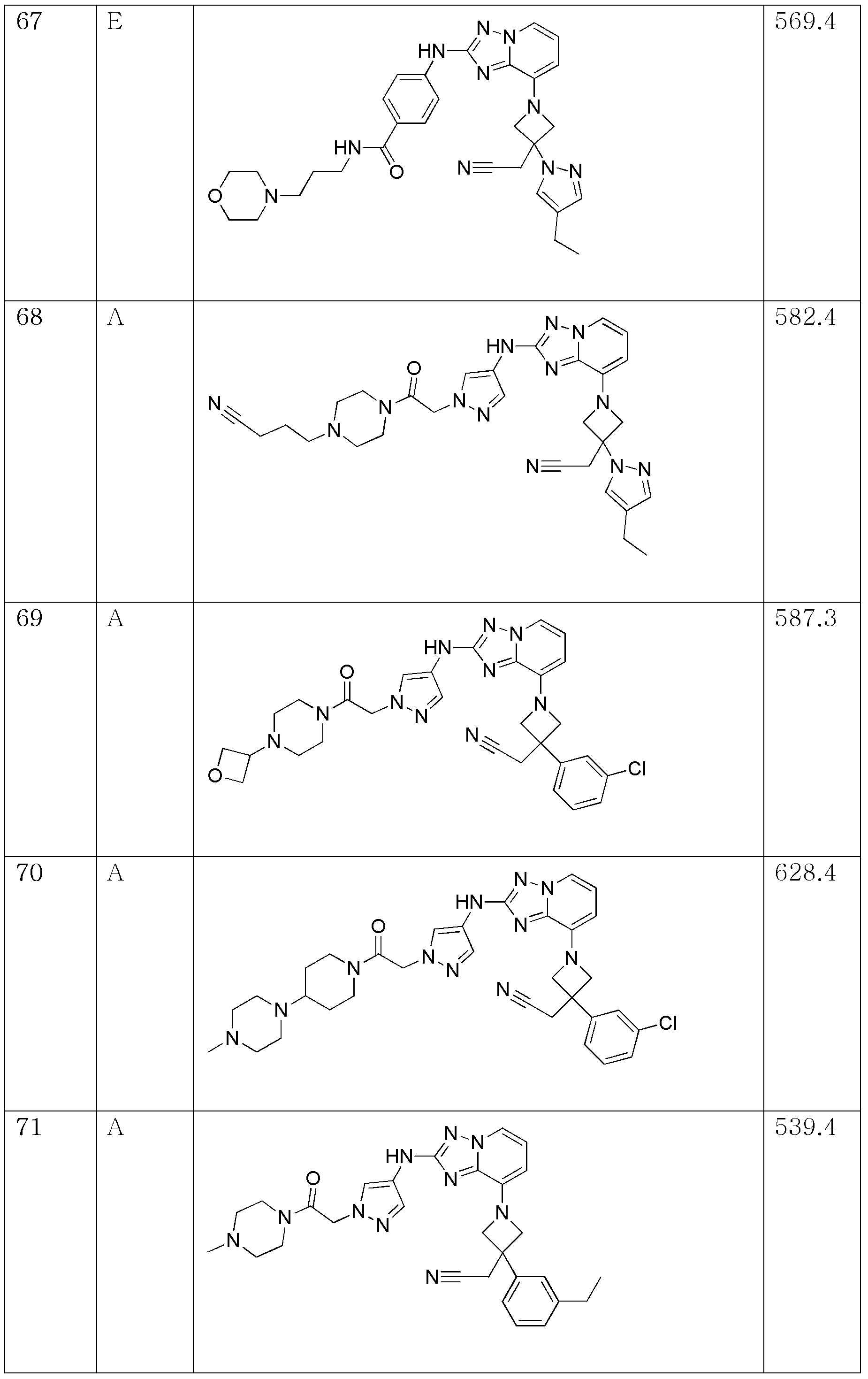 하기 표 2의 실시예를, 전술된 방법과 유사한 방법을 이용하여 제조하였다. 일반 절차 A를 사용하여 열거된 화합물은, 중간체 A 또는 다른 치환된 N-[8-브로모-[1,2,4]트라이아졸로[1,5-a]피리딘-2-일]-1H-피라졸-4-아민을 다양한 아제티딘 중간체와 커플링시킴으로써 제조할 수 있다. 상이한 부류의 아제티딘 중간체는, 전술된 일반 방법에 의해 제조할 수 있다.