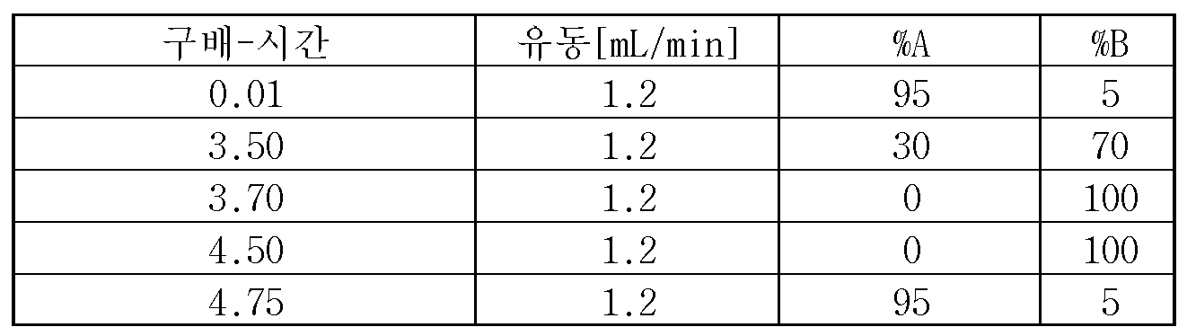 용매 A: 물 + 0.05% 트라이플루오로아세트산; 및 용매 B: 아세토나이트릴 + 0.05% 트라이플루오로아세트산으로 용리되는, C18-역상 칼럼(50 x 3.0 mm 쉼-팩 XR-ODS, 2.2 μm 입자 크기)을 갖는 쉬마즈 20A HPLC. 구배는 하기와 같다: