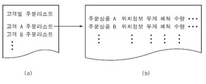 대형 매장, 소매거래 혹은 도매거래를 불문하고 온라인 주문된 다수 고객의 상품을 처리하기 위해서는 우선적으로 각 고객 주문상품의 픽업(pick-up)이 이루어져야 하고, 이후 픽업된 주문상품을 고객별로 포장하여 발송해야 한다. 이러한 경우 고객별 주문상품을 하나하나 픽업하고, 고객별로 주문된 상품을 구분하는 과정에 많은 시간과 인력이 투여되기 때문에 이를 최소화하기 위한 기술적 방안이 필요하다.In order to process a large number of online orders, regardless of whether it is a large store, a retail transaction, or a wholesale trade, a pick-up of each customer's order item must be performed first. Should be. In this case, because it takes a lot of time and manpower to pick up each product for each customer and sort the products ordered by customers, technical measures are needed to minimize them.