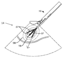 본 발명의 특별한 관심의 대상이 되는, 환자의 자궁 내에서 치료 프로브 또는 디바이스의 경질(transvaginal) 또는 복강경 위치 설정에 의존하는 자궁근종 치료법이 최근에 제안되었다. 고주파 또는 다른 에너지나 치료제 이송 니들이 상기 디바이스로부터 상기 근종 부근으로 또는 근종 내로 직접 전개되고, 에너지 및/또는 치료 물질이 상기 근종을 절제 또는 치료하기 위해 이송된다. 상기 근종의 위치 확인과 근종 내에서의 니들의 위치 설정을 용이하게 하기 위해, 상기 치료 디바이스는 니들을 지탱하는 축방향 샤프트에 대해 전체적으로 전방 또는 측방으로 조정 가능한 시야를 갖는 초음파 촬상 어레이(ultrasonic imaging array)를 포함한다. 상기 니들은 시각화 가능하고 조직 및 표적 근종 내로 향할 수 있도록 상기 샤프트로부터 그리고 상기 시야를 가로질러 전진된다.Of particular interest in the present invention, uterine fibroid therapy has recently been proposed which relies on transvaginal or laparoscopic positioning of the therapeutic probe or device in the uterus of a patient. A high frequency or other energy or therapeutic agent delivery needle is deployed directly from or near the myoma to the myoma and energy and / or therapeutic material is transferred to ablate or treat the myoma. In order to facilitate the positioning of the myoma and the positioning of the needle within the myoma, the treatment device has an ultrasonic imaging array having an overall forward or lateral adjustable field of view with respect to the axial shaft carrying the needle. ). The needle is advanced from the shaft and across the field of view so that it can be visualized and directed into tissue and target fibroids.