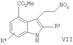 обработку метилового эфира 6-фтор-2-{4-[(метоксикарбонил-метил-амино)-метил]-фенил}-1H-индол-4-карбоновой кислоты N,N-диметил-2-нитроэтиленамином с образованием метилового эфира 6-фтор-2-{4-[(метоксикарбонил-метил-амино)-метил]-фенил}-3-((Е)-2-нитро-винил)-1H-индол-4-карбоновой кислоты;treatment of 6-fluoro-2- {4 - [(methoxycarbonyl-methyl-amino) methyl] phenyl} -1H-indole-4-carboxylic acid methyl ester with N, N-dimethyl-2-nitroethylenamine to form 6- methyl ester fluoro-2- {4 - [(methoxycarbonyl-methyl-amino) methyl] phenyl} -3 - ((E) -2-nitro-vinyl) -1H-indole-4-carboxylic acid;