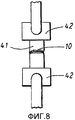 Образцы 41 для испытаний вырезают из поглощающего изделия 1 типа трусов, как показано на фиг.7, в зонах, которые снабжены соединительным элементом 13 в соответствии с изобретением. Ширина образцов 41 для испытаний составляет 25,4 мм и длина, если это возможно, должна быть на 50 мм больше расстояния между зажимами в приборе Instron 4301 для испытаний на растяжение. Фиг.8 и 9 показывают, как образцы 41 для испытаний закреплены в зажимах 42.