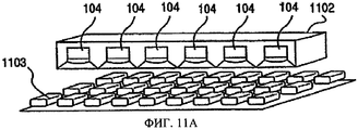 На фиг.2 представлено интегральное устройство формирования изображения, в соответствии с другим вариантом осуществления изобретения. Видно, что линзы 102а встроены в подложку 102 и расположены над каждым CogniSensor 104. В качестве примера использования устройства формирования изображения, на поверхности подложки 102 показаны расположенные там фрагменты 202 ДНК. Конфигурация каждого CogniSensor 104 может обеспечивать независимое распознавание, либо распознавание во взаимодействии с соседними CogniSensors 104, отдельного фрагмента ДНК и выдачу сигнала при идентификации этого фрагмента.Figure 2 shows an integrated imaging device in accordance with another embodiment of the invention. It can be seen that the