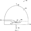 Источник белого света 110 включает нитридный чип СИД 112, который при возбуждении испускает первичное синее излучение. Чип 112 размещен на проводящей рамке чаши отражателя 114 и электрически соединен с проводниками 116 и 118. Проводники 116 и 118 подводят электрическую мощность к чипу 112. Чип 112 покрыт слоем 120 прозрачной смолы, которая включает конверсионный материал для преобразования длины волны излучения 122. Тип конверсионного материала, используемого для формирования слоя 120, может выбираться в зависимости от желательного спектрального распределения вторичного излучения, которое продуцируется материалом 122. Чип 112 и флуоресцентный слой 120 накрыты линзой 124. Линза 124 обычно изготавливается из прозрачной эпоксидной смолы или силикона. При работе источника белого света электрическое напряжение прикладывается к чипу 112, при этом из верхней поверхности чипа испускается первичное излучение. Часть испускаемого первичного излучения поглощается конверсионным материалом 122 в слое 120. Затем конверсионный материал 122 в ответ на поглощение первичного света испускает вторичное излучение, то есть преобразованный свет, имеющий более длинноволновый пик. Остающаяся непоглощенной часть испускаемого первичного излучения передается через конверсионный слой вместе с вторичным излучением. Линза 124 направляет непоглощенное первичное излучение и вторичное излучение в общем направлении, обозначенном стрелкой 126 как выходящий свет. Таким образом, выходящий свет - сложный свет, который составлен из первичного излучения, испускаемого чипом 112, и вторичного излучения, испускаемого конверсионным слоем 120. Конверсионный материал может также быть сконфигурирован таким образом, чтобы лишь малая часть или вообще весь первичный свет не покидал устройства, как в случае чипа, который испускает УФ первичный свет, объединенный с одним или более конверсионных материалов, которые испускают видимый вторичный свет.The