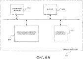 В варианте, показанном на Фиг.6A, процессор CPU 614 может быть реализован для включения какого-либо подходящего и совместимого микропроцессора, предпочтительно выполняющего команды программного обеспечения, для контроля и управления работой транспортного сервера 518. Показанный на Фиг.6A дисплей 638 может быть построен на основе какой-либо эффективной технологии дисплея, включая электронно-лучевой монитор или жидкокристаллический дисплей с подходящим экраном для представления различной информации пользователю. Представленные в варианте на Фиг.6A интерфейсы 640 ввода/вывода могут включать один или несколько интерфейсов ввода и/или вывода для приема и/или передачи информации любого нужного типа посредством пользовательского устройства 122. В варианте, показанном на Фиг.6А, запоминающее устройство 618 транспортного сервера может быть реализовано для включения произвольного сочетания требуемых запоминающих устройств, включая, но не ограничиваясь, постоянное запоминающее устройство (ПЗУ (ROM)), запоминающее устройство с произвольной выборкой (ЗУПВ (RAM)) и различные виды энергонезависимых запоминающих устройств, таких как дискеты, флэш-карты, компакт-диски или жесткие диски.In the embodiment shown in FIG. 6A, the