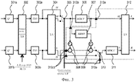 где g - действительнозначный коэффициент усиления, и α - комплекснозначный коэффициент предсказания. Предпочтительно, α выбирается так, чтобы минимизировать энергию остаточного сигнала D. Коэффициент усиления может определяться путем нормализации, т.е. так, чтобы обеспечить то, что мощность суммарного сигнала будет равна сумме мощностей левого и правого сигналов. Действительные и мнимые части каждого из сигналов L и R являются взаимно избыточными - в принципе, каждая из них может быть вычислена на основе другой, - но они являются полезными для того, чтобы сделать возможным последующее применение декодера с репликацией спектральной полосы (SBR) без возникновения слышимых артефактов из-за наложения спектров. По похожим причинам, использование передискретизированного представления сигнала также может выбираться с целью предотвращения появления артефактов, связанных с другой обработкой сигнала, адаптивной ко времени или к частоте (не показана), такой как, например, повышающее микширование монофонического сигнала в стереофонический сигнал. Последним этапом обработки в декодере является обратная QMF-фильтрация. Отмечается, что QMF-представление сигнала с ограниченной полосой допускает разностные способы с ограниченной полосой и способы «остаточного заполнения», которые могут интегрироваться в декодеры этого типа.where g is the real-valued gain, and α is the complex-valued prediction coefficient. Preferably, α is selected so as to minimize the energy of the residual signal D. The gain can be determined by normalization, i.e. so as to ensure that the power of the total signal is equal to the sum of the powers of the left and right signals. The real and imaginary parts of each of the L and R signals are mutually redundant - in principle, each of them can be calculated on the basis of the other - but they are useful in order to enable the subsequent use of a spectral band replication (SBR) decoder without occurrence audible artifacts due to overlapping spectra. For similar reasons, the use of a resampled signal representation can also be chosen to prevent artifacts associated with other signal processing, adaptive to time or frequency (not shown), such as, for example, up-mixing a monaural signal into a stereo signal. The final processing step in the decoder is inverse QMF filtering. It is noted that the QMF representation of a limited-band signal allows limited-band difference methods and “residual padding” methods that can be integrated into this type of decoder.