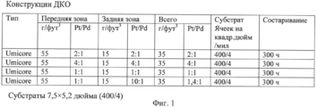 На фиг.1 представлена таблица, в которой перечислены типичные конструкции дизельных катализаторов окисления, соответствующие «зонированной» конфигурации по настоящему изобретению.Figure 1 presents a table listing typical designs of diesel oxidation catalysts corresponding to the "zoned" configuration of the present invention.