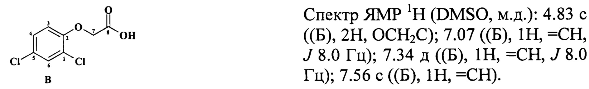 Известна 2,4-дихлорофеноксиуксусной кислоты диметиламмониевая соль (2), проявляющая гербицидную активность (Мельников Н.Н., Новожилов К.В., Белан С.Р. Справочник пестициды и регуляторы роста растений. М.: Химия, 1995, С. 60).Known 2,4-dichlorophenoxyacetic acid dimethylammonium salt (2), showing herbicidal activity (Melnikov N.N., Novozhilov K.V., Belan S.R. Handbook of pesticides and plant growth regulators. M: Chemistry, 1995, C. 60).