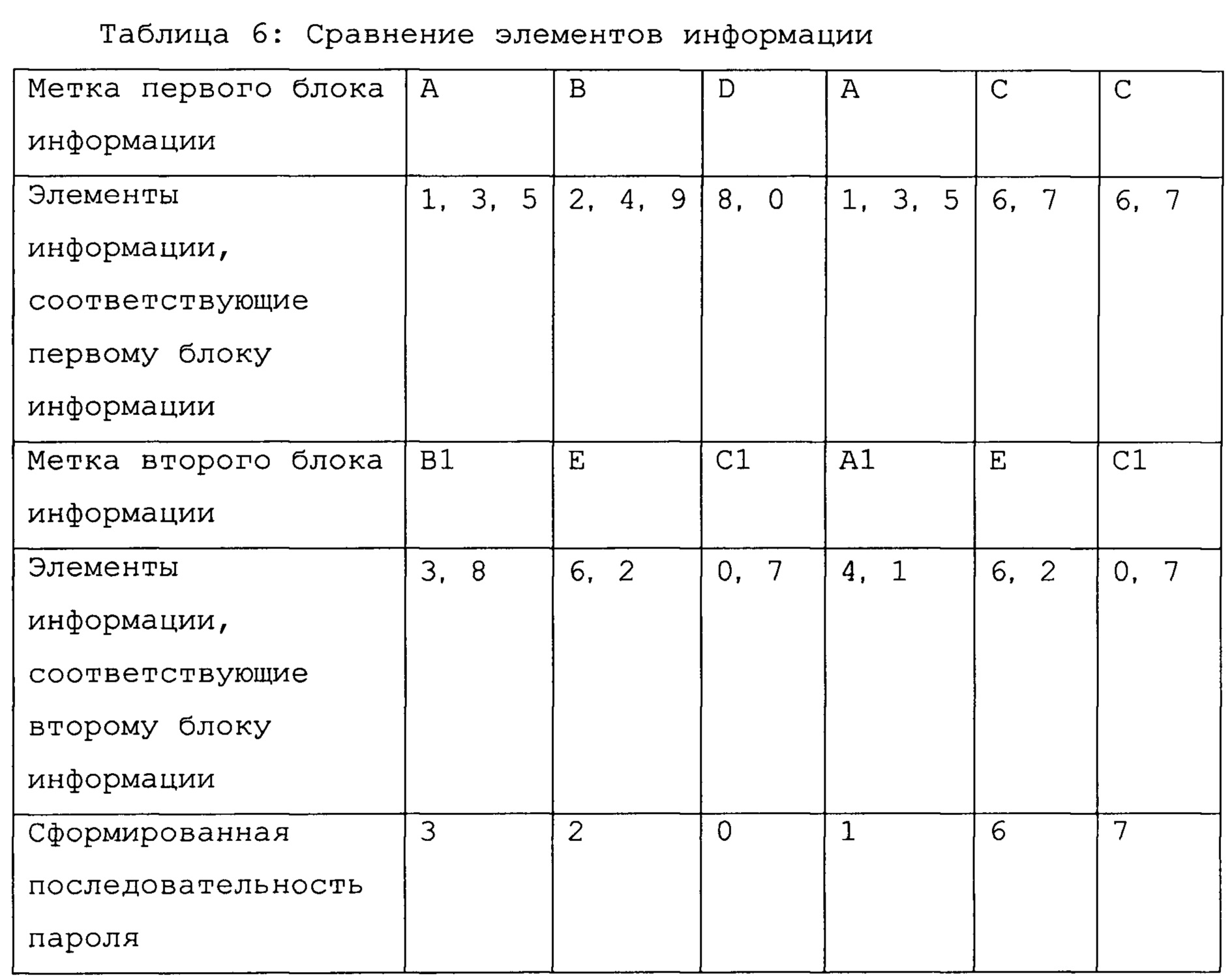сравнивают два ряда блоков информации друг с другом в соответствии с порядком появления каждого элемента информации, принимают элемент информации, общий для двух соответствующих блоков информации, связанных с одним и тем же местом нахождения клавиши физической клавиатуры, в качестве элемента информации, выбираемого пользователем как часть своего пароля, и формируют пароль путем объединения всех общих элементов информации друг с другом в последовательности.comparing two rows of information blocks with each other in accordance with the order of occurrence of each information element, accepting an information element common to two corresponding information blocks associated with the same physical keyboard key location as an information element selected by the user as part of his password, and form a password by combining all common information elements with each other in sequence.