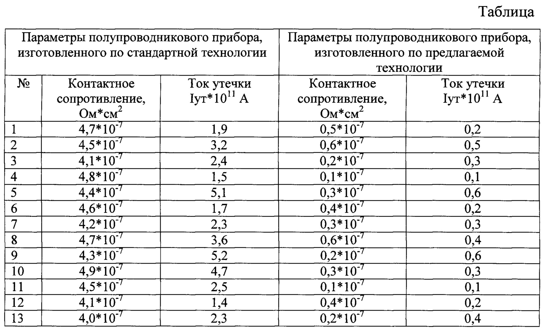 По предлагаемому способу были изготовлены и исследованы полупроводниковые приборы. Результаты обработки представлены в таблице.The proposed method were manufactured and investigated semiconductor devices. The results of processing are presented in the table.