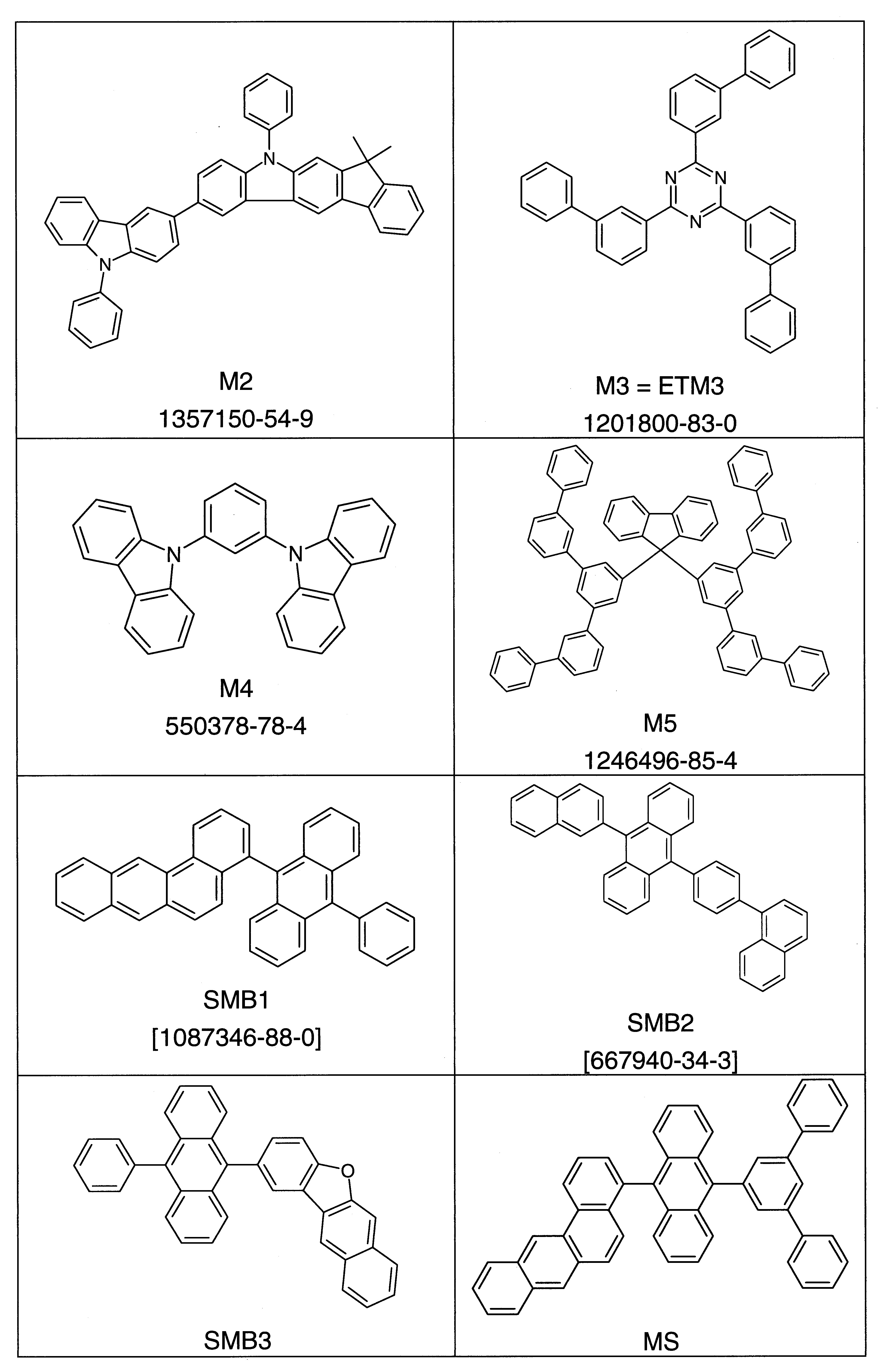 另外,可使用式(I)化合物或包含式(I)之結構的寡聚物、聚合物或樹枝狀聚合物作為主體材料及/或電子傳輸材料。較佳地可能為以下例子:使用具有蒽基團(Ar-76)至(Ar-78),較佳為(Ar-78)之結構/化合物、及/或式(II-9)、(II-10)、(II-24)、(II-25)、(III-9)、(III-10)、(III-24)、(III-25)、(IV-9)、(IV-10)、(IV-24)及/或(IV-25)化合物作為電子傳輸材料及/或基質材料。