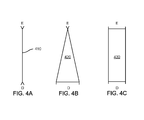 Another aspect of a touch-sensitive system is the shape and location of the optical beams and beam paths. In FIG. 1, the optical beams are shown as lines. These lines should be interpreted as representative of the beams, but the beams themselves may be different shapes and footprints. FIGS. 4A-4C are top views of differently shaped beam footprints, according to one embodiment. In FIG. 4A, a point emitter and point detector produce a narrow “pencil” beam with a line-like footprint. In FIG. 4B, a point emitter and wide detector (or vice versa) produces a fan-shaped beam with a triangular footprint. In FIG. 4C, a wide emitter and wide detector produces a “rectangular” beam with a rectangular footprint of fairly constant width. Depending on the width of the footprint, the transmission coefficient Tjk behaves as a binary or as an analog quantity. It is binary if the transmission coefficient transitions fairly abruptly from one extreme value to the other extreme value as a touch point passes through the beam. For example, if the beam is very narrow, it will either be fully blocked or fully unblocked. If the beam is wide, it may be partially blocked as the touch point passes through the beam, leading to a more analog behavior.