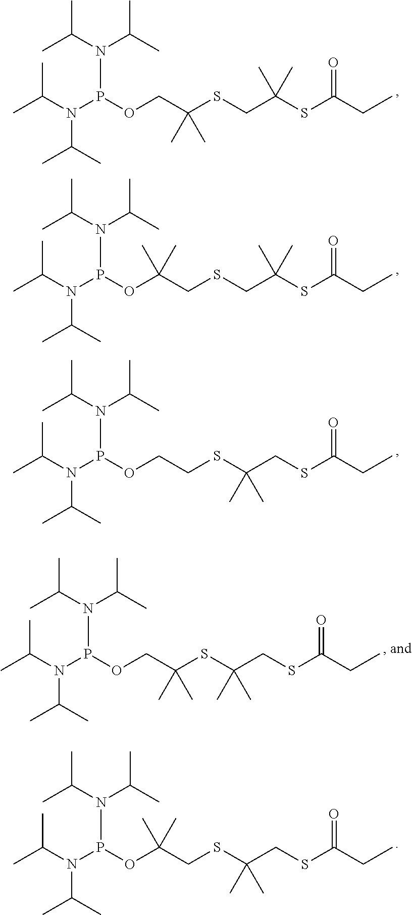- SKJVUPWWGFSGCG-UHFFFAOYSA-N CC(C)C(=O)SCC(C)(C)OC(C)(C)COP(N(C(C)C)C(C)C)N(C(C)C)C(C)C.CC(C)N(C(C)C)P(OC(C)(C)C(C)(C)OC(C)(C)C(C)(C)SC(=O)C(C)(C)C)N(C(C)C)C(C)C.CC(C)N(C(C)C)P(OC(C)(C)COCC(C)(C)SC(=O)C(C)(C)C)N(C(C)C)C(C)C.CC(C)N(C(C)C)P(OCC(C)(C)OC(C)(C)CSC(=O)C(C)(C)C)N(C(C)C)C(C)C.CC(C)N(C(C)C)P(OCCOCC(C)(C)SC(=O)C(C)(C)C)N(C(C)C)C(C)C Chemical compound CC(C)C(=O)SCC(C)(C)OC(C)(C)COP(N(C(C)C)C(C)C)N(C(C)C)C(C)C.CC(C)N(C(C)C)P(OC(C)(C)C(C)(C)OC(C)(C)C(C)(C)SC(=O)C(C)(C)C)N(C(C)C)C(C)C.CC(C)N(C(C)C)P(OC(C)(C)COCC(C)(C)SC(=O)C(C)(C)C)N(C(C)C)C(C)C.CC(C)N(C(C)C)P(OCC(C)(C)OC(C)(C)CSC(=O)C(C)(C)C)N(C(C)C)C(C)C.CC(C)N(C(C)C)P(OCCOCC(C)(C)SC(=O)C(C)(C)C)N(C(C)C)C(C)C SKJVUPWWGFSGCG-UHFFFAOYSA-N 0.000 description 1