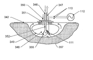It is connected to an ultrasonic frequency electrical signal generator run at the appropriate frequencies (112) (shown schematically) by electrical leads (113) running through the boss (351) and the hollow body (348).