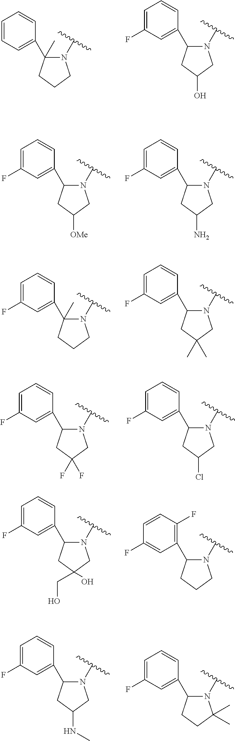 Recent literature has also shown that overexpression, activation, amplification and/or mutation of Trk's are associated with many cancers including neuroblastoma (Brodeur, G. M., Nat. Rev. Cancer 2003, 3, 203-216), ovarian cancer (Davidson. B., et al., Clin. Cancer Res. 2003, 9, 2248-2259), breast cancer (Kruettgen et al, Brain Pathology 2006, 16: 304-310), prostate cancer (Dionne et al, Clin. Cancer Res. 1998, 4(8): 1887-1898), pancreatic cancer (Dang et al, Journal of Gastroenterology and Hepatology 2006, 21(5): 850-858), multiple myeloma (Hu et al, Cancer Genetics and Cytogenetics 2007, 178: 1-10), astrocytoma and medulloblastoma (Kruettgen et al, Brain Pathology 2006, 16: 304-310) glioma (Hansen et al, Journal of Neurochemistry 2007, 103: 259-275), melanoma (Truzzi et al, Journal of Investigative Dermatology 2008, 128(8): 2031-2040, thyroid carcinoma (Brzezianska et al, Neuroendocrinology Letters 2007, 28(3), 221-229.), lung adenocarcinoma (Perez-Pinera et al, Molecular and Cellular Biochemistry 2007, 295(1&2), 19-26), large cell neuroendocrine tumnors (Marchetti et al, Human Mutation 2008, 29(5), 609-616), and colorectal cancer (Bardelli, A., Science 2003, 300, 949). In preclinical models of cancer, Trk inhibitors are efficacious in both inhibiting tumor growth and stopping tumor metastasis. In particular, non-selective small molecule inhibitors of Trk A, B and C and Trk/Fc chimeras were efficacious in both inhibiting tumor growth and stopping tumor metastasis (Nakagawara, A. (2001) Cancer Letters 169:107-114; Meyer, J. et al. (2007) Leukemia, 1-10; Pierottia, M. A. and Greco A., (2006) Cancer Letters 232:90-98; Eric Adriaenssens, E. et al. Cancer Res (2008) 68:(2) 346-351) (Truzzi et al, Journal of Investigative Dermatology 2008, 128(8): 2031-2040. Therefore, an inhibitor of the Trk family of kinases is expected to have utility in the treatment of cancer.