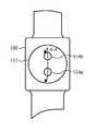 FIG. 1B depicts a bottom plan view of the wearable electronic device of FIG. 1A, showing two sensor windows 114 a, 114 b associated with an optical sensing system. In many cases, an optical sensing system can be a distributed system such that one portion of the optical sensing system is positioned proximate to one of the two sensor windows 114 a, 114 b whereas another portion of the optical sensing system is positioned proximate to another of the two sensor windows 114 a, 114 b. In still further embodiments, an optical sensing system can be disposed proximate to a single sensor window. In still further embodiments, an optical sensing system can be disposed proximate to more than two sensor windows. In still further examples, an optical sensing system can be disposed in another manner that incorporates the optical sensing system within an optical circuit that includes a measurement site or a measurement subject.