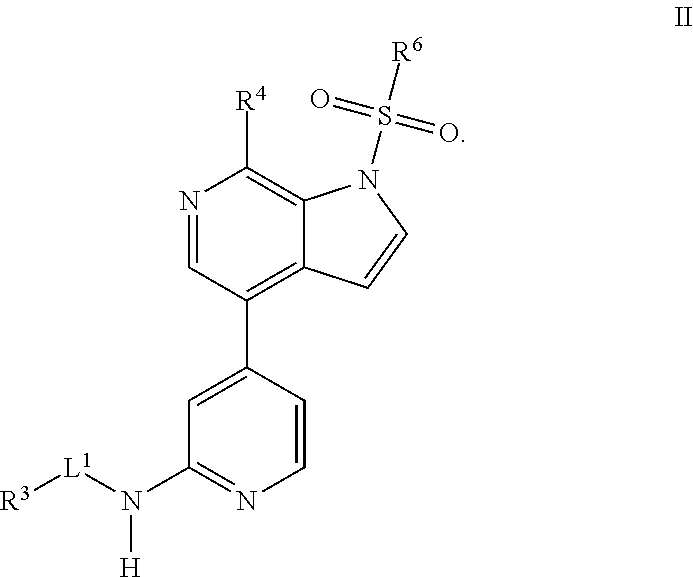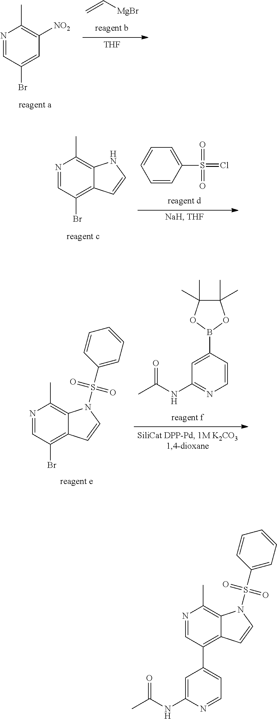 Using the appropriate starting materials, followed the procedure in Step 2 of Example 5 with the following modification: Heated at 90° C. for 10 min and 100° C. for 5 min. Prep HPLC yielded both N-{4-[2-methyl-1-(phenylsulfonyl)-1H-pyrrolo[2,3-c]pyridin-4-yl]pyridin-2-yl}acetamide (125 mg, 70%) LC-MS: (AA) ES+ 407.1, RT=10.06 min; and N-{4-[2-ethyl-1-(phenylsulfonyl)-H-pyrrolo[2,3-c]pyridin-4-yl]pyridin-2-yl}acetamide (15 mg, 8.1%). LCMS (AA): m/z=421.1 (M+H), RT=8.77 min.
