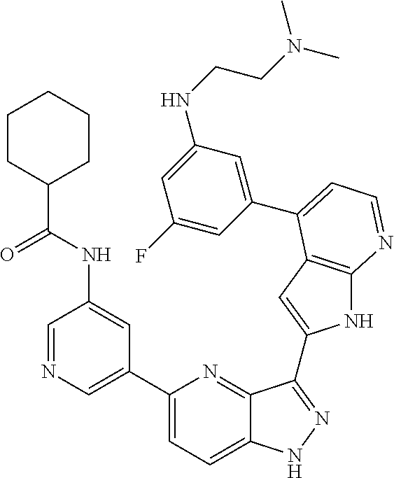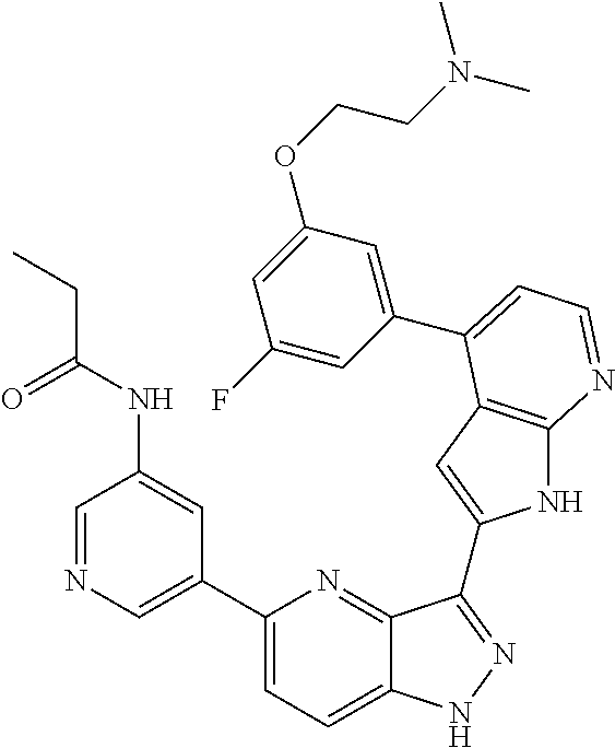 - LZYUKLYFCLGEIU-UHFFFAOYSA-N CC1=CC=NC=C1C1=CC=C2NN=C(C3=CC4=C(N=CC=C4N4CCN(C)CC4)N3)C2=N1 Chemical compound CC1=CC=NC=C1C1=CC=C2NN=C(C3=CC4=C(N=CC=C4N4CCN(C)CC4)N3)C2=N1 LZYUKLYFCLGEIU-UHFFFAOYSA-N 0.000 description 2