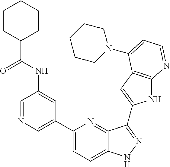 - AVZXQDZSPHYSLW-UHFFFAOYSA-N C1=CC(C2=CC=NC3=C2C=C(C2=NNC4=CC=C(C5=CN=CN=C5)N=C42)N3)=CN=C1 Chemical compound C1=CC(C2=CC=NC3=C2C=C(C2=NNC4=CC=C(C5=CN=CN=C5)N=C42)N3)=CN=C1 AVZXQDZSPHYSLW-UHFFFAOYSA-N 0.000 description 2