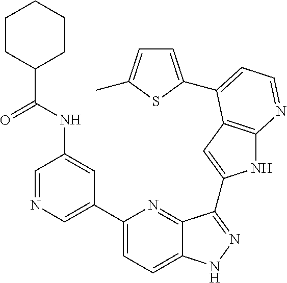 - POGSQMKPZLPMJN-UHFFFAOYSA-N C1=CC(C2=CC=NC3=C2C=C(C2=NNC4=CC=C(C5=CN=CC(OC6CCNCC6)=C5)N=C42)N3)=CS1 Chemical compound C1=CC(C2=CC=NC3=C2C=C(C2=NNC4=CC=C(C5=CN=CC(OC6CCNCC6)=C5)N=C42)N3)=CS1 POGSQMKPZLPMJN-UHFFFAOYSA-N 0.000 description 2