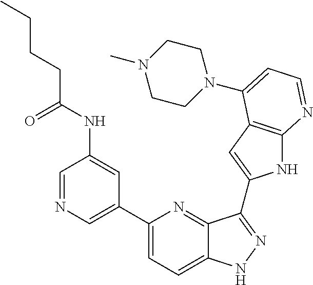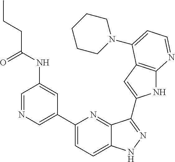 - YVDLKTZGBCCLAD-UHFFFAOYSA-N CCCC(=O)NC1=CC(C2=CC=C3NN=C(C4=CC5=C(N=CC=C5C5=C(F)C=CC=C5)N4)C3=N2)=CN=C1 Chemical compound CCCC(=O)NC1=CC(C2=CC=C3NN=C(C4=CC5=C(N=CC=C5C5=C(F)C=CC=C5)N4)C3=N2)=CN=C1 YVDLKTZGBCCLAD-UHFFFAOYSA-N 0.000 description 2
