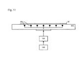 FIG. 9 depicts a top view of a substrate table showing the geometry of a substrate heater arranged to dissipate more power in the lower region of the substrate table than in the upper region;