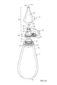 - said member is a nozzle member, with the nozzle member including a nozzle extending from the base and through which the passage also extends, with the nozzle cooperating with the cap to open and close the cap end opening.