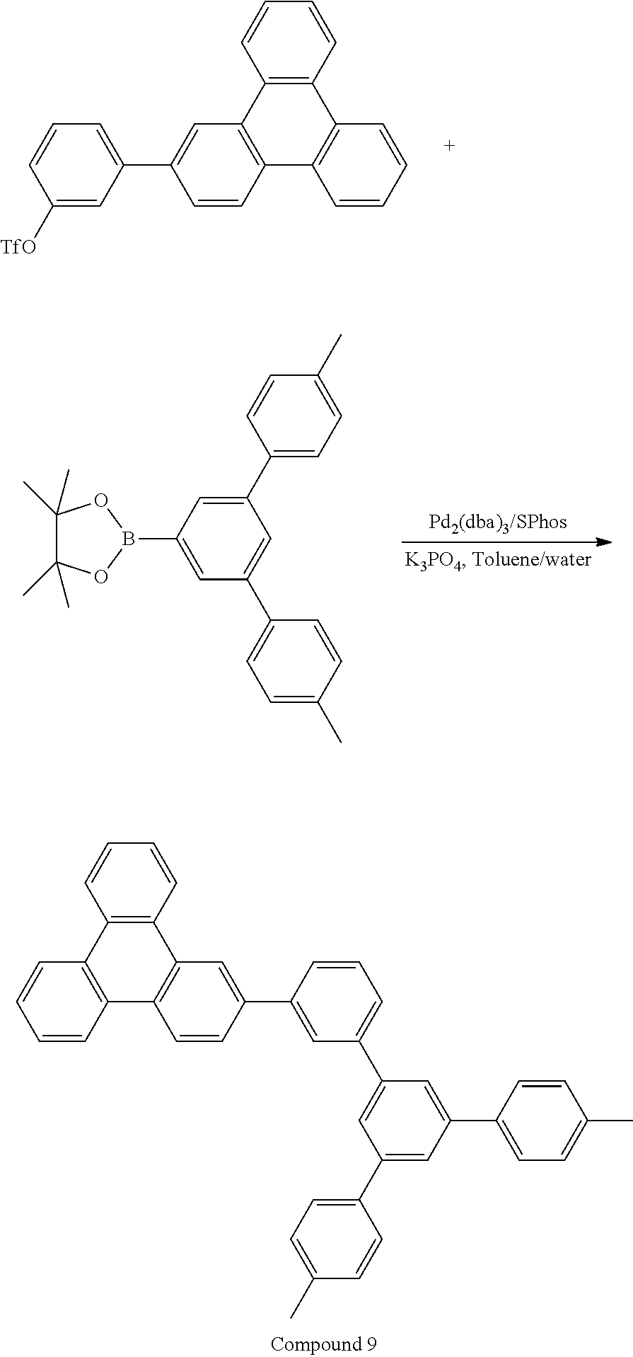 It is noted here that the synthetic procedure for the functionalized intermediate, 3-(triphenylen-2-yl)phenyl trifluoromethanesulfonate has significant advantages over the previously described functional intermediate, 4,4,5,5-tetramethyl-2-(triphenylen-2-yl)-1,3,2-dioxaborolane. Due to significant differences in polarity and excellent solubility, 2-(3-methoxyphenyl)triphenylene can be readily purified by column chromatography from the mixture of unreacted triphenylene and the disubstituted 3-methoxyphenyl triphenylene. In comparison, it is found in practice that the separation of 4,4,5,5-tetramethyl-2-(triphenylen-2-yl)-1,3,2-dioxaborolane from the corresponding disubstituted material is much more difficult and time consuming Therefore the synthetic route for 3-(triphenylen-2-yl)phenyl trifluoromethanesulfonate is advantageous for obtaining high purity triphenylene based optoelectronic materials.