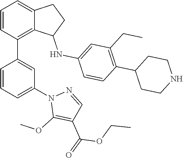- (+)-1-(5-(3-((4-(1-(cyclopropanecarbonyl)piperidin-4-yl)-3-ethylphenyl)amino)-2,3-dihydro-1H-inden-4-yl)-2-methoxyphenyl)-5-methoxy-1H-pyrazole-4-carboxylic acid;