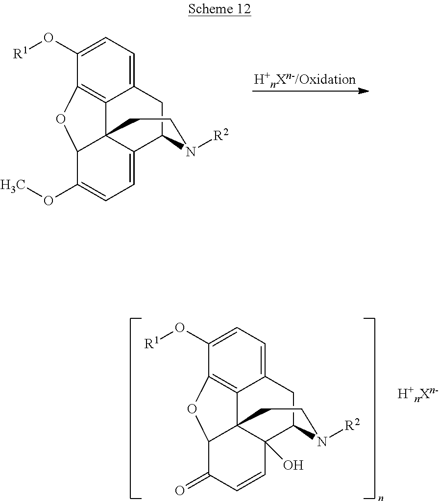 - the 14-hydroxymorphinone intermediate shown in Scheme 1 is not only the immediate precursor to oxymorphone, it is also often found in the final oxymorphone salt used in pharmaceutical compositions, e.g., in oxymorphone hydrochloride.