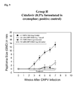 FIG. 19 shows a graph of papilloma size (GMD) in mm over time for the formulation used in Group B. Papillomas were induced at 2 sites with 5 μg of wt-CRPV plasmid stock (●,▾), and at 2 sites with 5 μg mE8-CRPV plasmid stock (●,Δ). Left sites (L1 and L2) were treated topically with the 2% Nitricil™ NVN1 formulation (●,◯) and right sites (R1 and R2) were untreated (▾,Δ). Each symbol represents the mean (±SEM) of GMDs of the weekly measurements.