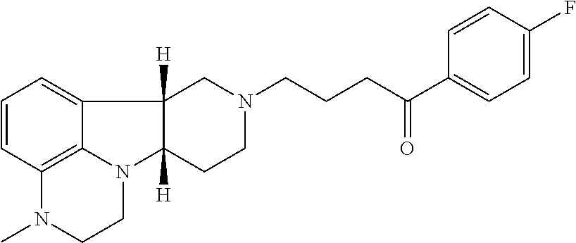 In another further embodiment, the effective amount of the Compound of Formula I is about 1 mg to about 140 mg per dose per day, in another embodiment, about 2.5 mg to about 120 mg, in another embodiment about 10 mg to about 120 mg per dose per day, in another embodiment, about 60 mg to about 120 mg per dose per day, in still another embodiment, about 10 mg to about 60 mg per dose per day, in another embodiment, about 20 mg to about 60 mg per dose per day, in still another embodiment, about 20 mg, about 40 mg, or about 60 mg per dose per day. The compounds of the current invention are effective in treating both the positive symptoms, which occur during active or acute phase of psychosis (e.g., effective in treating positive symptoms such as delusions and hallucinations) as well as negative and other residual symptoms generally observed in the residual phase. Preferably, the effective amount for the treatment of acute and residual symptoms of schizophrenia is about 60 mg per day. In particular embodiment, the dosages disclose herein for oral administration are based on the amount of the Compounds of Formula I in acid addition salt form, particularly toluene sulfonic acid addition salt form.
