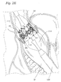 FIG. 1A is a perspective view of an exemplary fabric-covered pinch device 20 (grip, dock, constrictor, etc.), and FIG. 1B is a perspective view of an inner body 22 of the pinch device without a fabric covering 24. The pinch device 20 has a generally annular or toroidal body arranged around a vertical Z-axis 26 and formed from a suitable super-elastic metal or alloy, such as Nitinol. Other shapes and/or materials are also possible. Optionally, spring steel, a cobalt-chrome alloy such as Elgiloy®, or other such elastic metals can be utilized with some modification to the delivery system. Desirably, the material from which the pinch device 20 is fabricated allows it to be radially compressed to a reduced profile for delivery through the patient's vasculature and automatically expanded to its functional size and shape when deployed. With a supra-elastic material such as Nitinol the reduced radial profile can be very small, whereas with other materials which are not so flexible, the pinch device 20 may only be partially constricted for delivery and then permitted to expand.