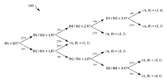 At a first leaf, D1 and D2 are compared to determine which is larger. Based on that comparison, the tree 900 further compares ratios of D1 and D2 against different values to determine one of eight different possible pairs of quantized weighting coefficients, where each pair includes a first quantized weighting coefficient applied against pixel values of a video block of the first reference frame and a second quantized weighting coefficient applied against pixel values of a video block of the second reference frame.