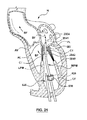 FIG. 21 is an illustration of a valve delivery system being positioned through the chordae management catheter of FIG. 5 in situ, wherein the displacement component of the chordae management catheter is in at least a partially unexpanded configuration and the chordae management catheter has been at least partially proximally retracted or withdrawn.
