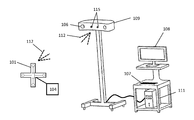 - the tracking array includes at least one LED 103 for high rate data transmission, and two or more active and/or passive markers that may emit or reflect optical signals such as visible light, radio frequency, infrared, sound, or electromagnetic signals.