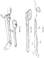 FIGS. 37A and 37B illustrate variations on the interaction between the capture element and the tissue penetrator. In FIG. 37A, the tissue penetrator couples with a loop of the capture element; thus the flexible loop can be preloaded onto the tissue penetrator before it is retracted into the lower jaw and primed to “fire” across the tissue. In some variations it may be beneficial to have the capture element be coupled to the tissue penetrator via a loop of suture material or other material that does not self-expand, such as the expandable capture element does. This may help with pre-loading the capture element onto the tissue penetrator, and may also help in reducing the force needed to pass the capturing element through the tissue. FIG. 37B illustrates one example in which a loop of suture is connected to the capture element that is also connected to a length of suture, as shown.