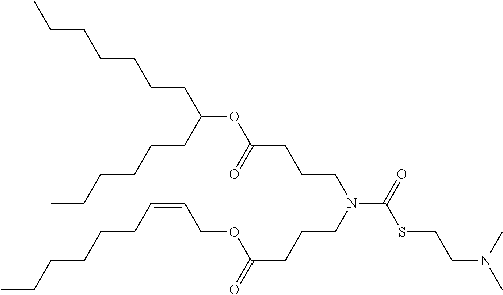 The results are shown in Table 1. In general increasing lipophilicity via the ester near the ionizable head group lowers the measured pKa while making the calculated pKa more basic. Adding lipophilicity in the alcohol while shortening the length of the ester chain can have a major impact on measured pKa. For example, shortening the ester to butanoate has no impact when the lipophilicity of the alcohol is increased to a branched alkyl group (see: ATX-0057 and ATX-0058 vs ATX-0002). A major impact is seen when shortening the ester to an acetate, e.g., ATX-0061/ATX-0064 (Δ=−0.90) and ATX-0063 (Δ=−0.7) for 1-branched/1-Z-2-nonenol ester; and ATX-0062/ATX-0065 (Δ=−3.20) for acetate/bis-branched ester with a Δc Log P+4.0 vs ATX-0002.