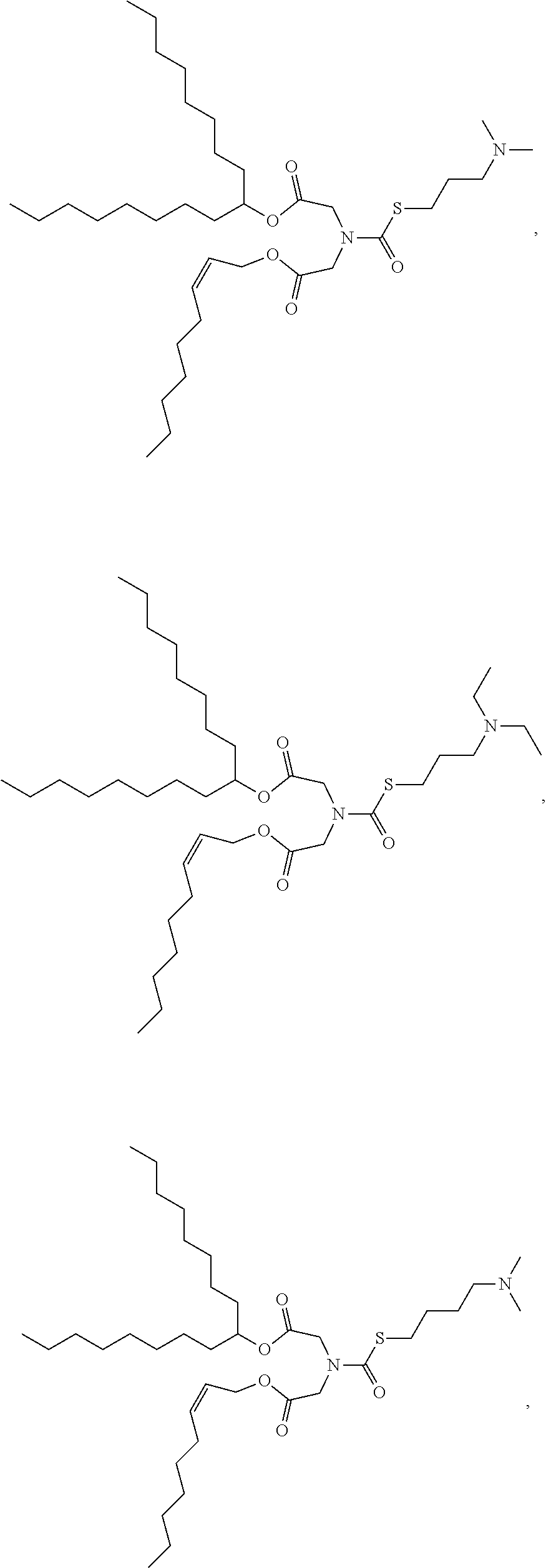 Levels of mRNA in plasma were measured and compared following injection of nanoparticles comprising different cationic lipids. Female Balb/c mice (6-8 week old) were used for evaluation of plasma erythropoietin (epo) levels in vivo following injection of lipid encapsulated mouse epo mRNA. All formulations were administered intravenously via tail vein injection at a dose of 0.03 and 0.1 mg/kg at a dosing volume of 5 ml/kg. Terminal blood collection was performed via cardiac puncture under 2% isoflurane at 6 hours after formulation injections. Blood was collected into 0.109 M citrate buffer tube and processed by centrifugation at 5000 rpm for 10 minutes. Serum was collected and epo mRNA levels were analyzed. Results are shown at FIG. 17. Results show a substantial improvement over ATX-0002 for ATX-0057, ATX-0081, ATX-0082, ATX-0083, ATX-0084, ATX-0085, ATX-0086, and ATX-0087.