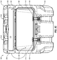 FIG. 1B depicts an external view of the front portion 126 of the tub portion 102. As described above, the front portion 126 may include or retain the latches 108 and the clasp subassembly 112. In addition, the front portion 126 may define two latch channels 160A and 160B. The latches 108 may be disposed in the latch channels 160A and 160B. The latch channels 160A and 160B may be separated by a central surface 162. The second recess 124 may be defined in the central surface 162.