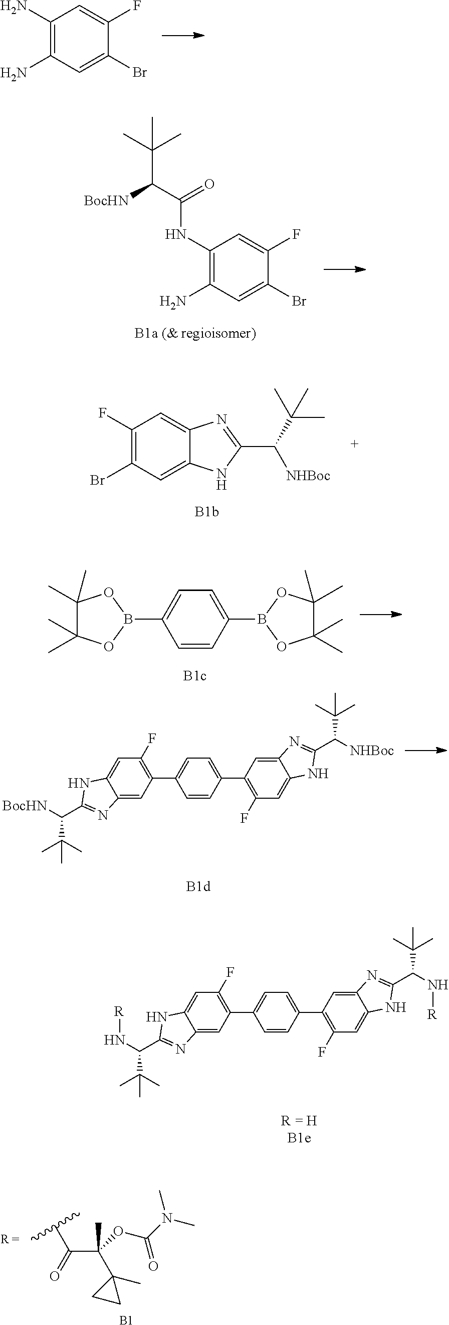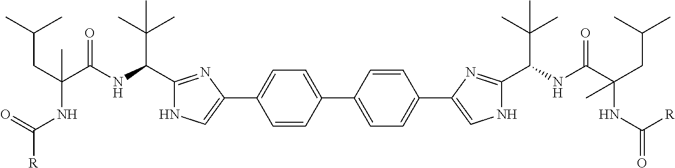 Asymmetric centers exist in the compounds of the present disclosure. These centers are designated by the symbols “R” or “S”, depending on the configuration of substituents around the chiral carbon atom. It should be understood that the disclosure encompasses all stereochemical isomeric forms, or mixtures thereof, which possess the ability to inhibit NS5A. Individual stereoisomers of compounds can be prepared synthetically from commercially available starting materials which contain chiral centers or by preparation of mixtures of enantiomeric products followed by separation such as conversion to a mixture of diastereomers followed by separation or recrystallization, chromatographic techniques, or direct separation of enantiomers on chiral chromatographic columns. Starting compounds of particular stereochemistry are either commercially available or can be made and resolved by techniques known in the art.