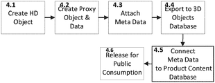 - the HD Objects provided by product manufacturers contain intellectual property “IP”. Manufacturers can upload the HD Objects, related Meta Data and Product Data to a Data Vault programmatically or through a graphical user interface over the Internet or they can connect to the invention via an API developed by inventor to connect product stored in a manufacturer's database with the 3D Proxy and HD Objects.