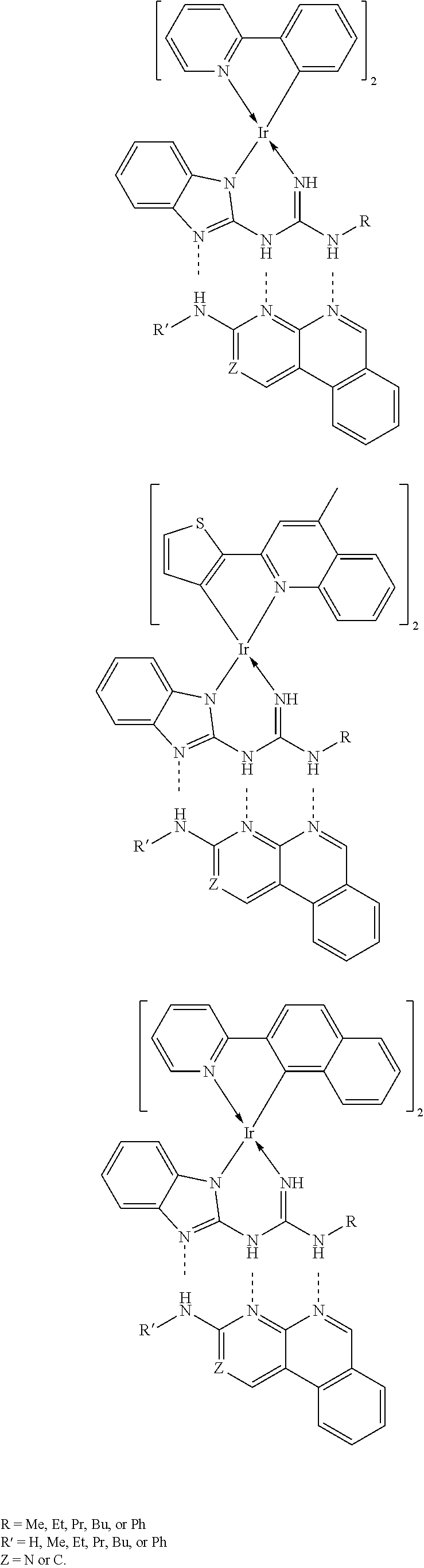 - where complex 1 is host, complex 2 is ligand, complex 3 is guest, and complex 1•3 is a host-guest complex. A limited retrosynthetic analysis of the components complex 1, complex 2 and complex 3 is provided to the right of complex 1•3. The triple H-bonded heterodimeric system in complex 1•3 exhibits modulated photophysical properties from that of the corresponding mononuclear cyclometalated IrIII (complex 1).