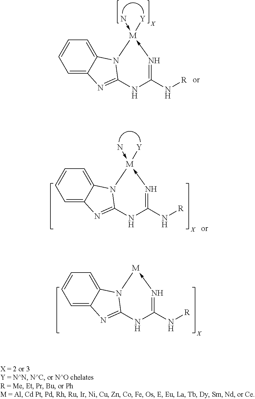 The iridium dimer complex [Ir(ppy)2Cl]2 (39.7 mg, 3.70×10−5 mol),[20] guanidine 2b (13.2 mg, 2.5 equiv.) and potassium carbonate (50 mg, 10 equiv.) were added to 12 mL of dry toluene. The reaction mixture was stirred overnight at 110° C. under a N2 atmosphere. The solvent was removed under reduced pressure. A small amount of dichloromethane was added to dissolve the solid (8-12 mL) and the mixture was extracted with water (3×20 mL) to remove the excess base. The organic layers were combined and the solvent removed under reduced pressure. Further purification included precipitation and column chromatography (silica gel, DCM/MeOH, 10:0.25-10:1, Rf=0.3). Final product 1 was obtained as a bright yellow powder in 88% yield. 1H NMR (600 MHz, 298 K, chloroform-d): δ 8.68 (dd, 1H, J=5.9, 0.8 Hz), 8.15-8.04 (m, 1H), 7.88 (d, 1H, J=8.1 Hz), 7.78 (d, 1H, J=8.0 Hz), 7.73 (td, 1H, J=8.0, 1.6 Hz), 7.67 (dd, 1H, J=7.4, 1.3 Hz), 7.60 (d, 2H, J=7.8 Hz), 7.15 (d, 1H, J=7.9 Hz), 7.08 (ddd, 1H, J=7.3, 5.9, 1.3 Hz), 7.01-6.87 (m, 4H), 6.79 (dtd, 2H, J=20.6, 7.4, 1.3 Hz), 6.68-6.62 (m, 1H), 6.43 (dd, 1H, J=7.6, 0.8 Hz), 6.24-6.19 (m, 1H), 6.15 (s, 1H), 6.09 (d, 1H, J=8.3 Hz), 5.72 (s, 1H), 4.56 (s, 1H), 3.04-2.78 (m, 2H), 1.41 (ddd, 2H, J=14.0, 7.1, 3.5 Hz), 1.23 (dd, 2H, J=14.0, 6.6 Hz), 0.79 (t, 3H, J=7.3 Hz). 13C NMR (100 MHz, 298K, chloroform-d): δ 169.15, 168.17, 153.61, 151.88, 151.57, 150.01, 148.83, 147.52, 144.62, 144.47, 141.20, 136.82, 136.51, 133.05, 132.01, 129.72, 124.57, 124.01, 122.63, 121.84, 121.62, 121.33, 121.08, 118.80, 116.86, 110.65, 77.16, 41.06, 30.85, 20.05, 13.76. EI-MS m/z calculated: 731.2348 found: 732.2450 [M+]. Anal. calcd. for C34H32IrN7: C, 55.87; H, 4.41; N, 13.41. Found: C, 55.96; H, 4.31; N, 13.35.