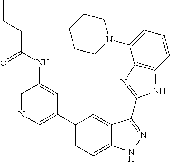 - WLTAWFKBGJFQRT-UHFFFAOYSA-N CCCC(=O)NC1=CC(C2=CC=C3N/N=C(/C4=NC5=C(C=CC=C5N5CCN(C)CC5)N4)C3=C2)=CN=C1 Chemical compound CCCC(=O)NC1=CC(C2=CC=C3N/N=C(/C4=NC5=C(C=CC=C5N5CCN(C)CC5)N4)C3=C2)=CN=C1 WLTAWFKBGJFQRT-UHFFFAOYSA-N 0.000 description 3