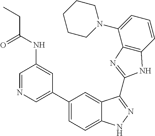 - HZCOIPNREIMBGP-UHFFFAOYSA-N CCC(=O)NC1=CC(C2=CC=C3N/N=C(/C4=NC5=C(C=CC=C5C5=CC(F)=CC=C5)N4)C3=C2)=CN=C1 Chemical compound CCC(=O)NC1=CC(C2=CC=C3N/N=C(/C4=NC5=C(C=CC=C5C5=CC(F)=CC=C5)N4)C3=C2)=CN=C1 HZCOIPNREIMBGP-UHFFFAOYSA-N 0.000 description 2