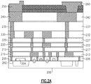 FIGS. 26A-26B illustrate electrical and visual monitoring results from testing a spaced pair of conductive structures 2824. FIG. 26A illustrates a very fast TLP (VFTLP) IV curve 2800A measured on a pair of spaced conductive structures fabricated using metal 2 structures. The IV curve 2800A corresponds to the IV response of the conductive structures 2824 tested using a charged 50 Ohm transmission line. As the IV curve 2800A illustrates, as the applied VFTLP voltage is increased, the voltage across the spaced pair of conductive structures initially increases proportionally in the baseline region 2804, starts to rapidly decrease in a trigger region 2808 and snaps to a holding voltage in a hold region 2812. The VFTLP current initially slowly increases in the baseline region 2804 and increases very rapidly from the trigger region 2808 to the holding region 2812.