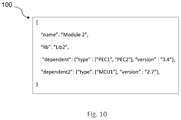 FIG. 10 is a block diagram of a property table 100 defining module properties in accordance with an embodiment of the present invention. The property table 100 includes the module properties of module name, module library, and component properties. The property table 80 is for the module “Module 2”, which is a primitive module. In the property table 100, the module property of name is set to “Module 2”, and the module property of library is set to “Lib 2” to indicate that “Module 2” is stored in the library named “Lib 2”. The component properties of the property table 80 include the two device-dependent blocks that are contained in “Module 2”. The first device-dependent block is named “dependent”, has a device type property set to “PEC1” and “PEC2”, and has a version property set to “3.4”. This device type property setting indicates that the device-dependent block “dependent” is compatible with two types of device, “PEC1” and “PEC2”. The second device-dependent block is named “dependent 2”, has a device type property set to “MCU1”, and has a version property set to “2.7”. This device type property setting indicates that dependent block “dependent 2” is compatible with one type of device, “MCU1”.